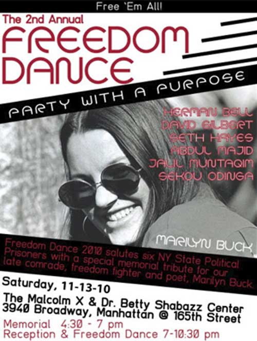 A memorial will be held for Marilyn Buck on Saturday November 13, 4:30–7:00 p.m. at the Malcolm X and Dr. Betty Shabazz Center, 3940 Broadway, Manhattan, followed by dinner and a Freedom Dance for political prisoners. Click here for info (including past gatherings).