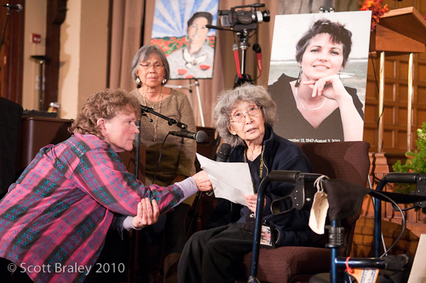 Graciela Trevisan’s statement from Cristina Peri Rossi, whose collection of poetry, State of Exile in Spanish was translated by Marilyn and received a nomination for best translation at the Northern California Book Reviewers Association Awards Ceremony 2008. Linda Evans, Marilyn’s co-defendant and fellow Austinian and Miranda Bergman, artist, whose friendship with Marilyn goes back to a San Francisco commune in Haight Asbury Days. Marilyn’s teachers and advisors from New College of California on her master’s thesis were present: David Meltzer and others not on the program. Marilyn’s poetry teacher, Maria Poblet, spoke, and Assata Shakur’s voice left a message for Marilyn before her death which was played for those assembled.